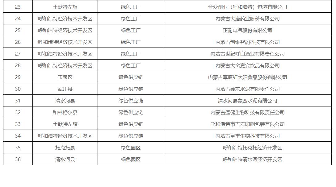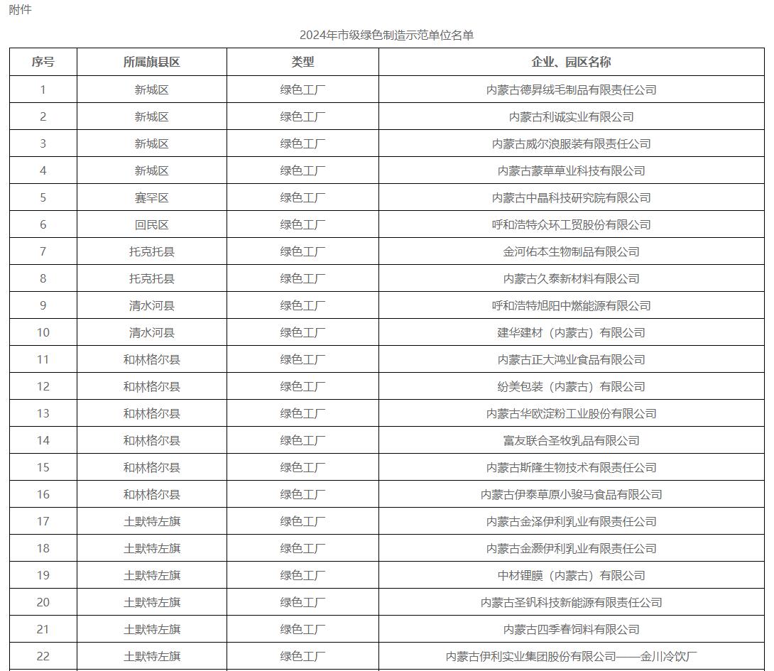呼和浩特市工业和信息化局关于公布2024年度市级绿色制造示范单位的通知